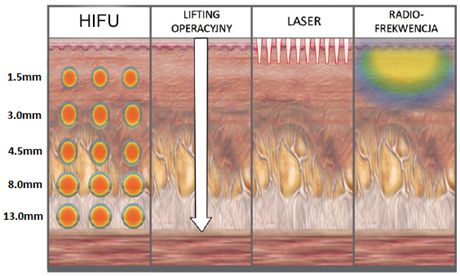 Lifting obszaru objętego zabiegiem jak owal twarzy, policzki, czoło, brzuch, uda, obszar nad kolanami